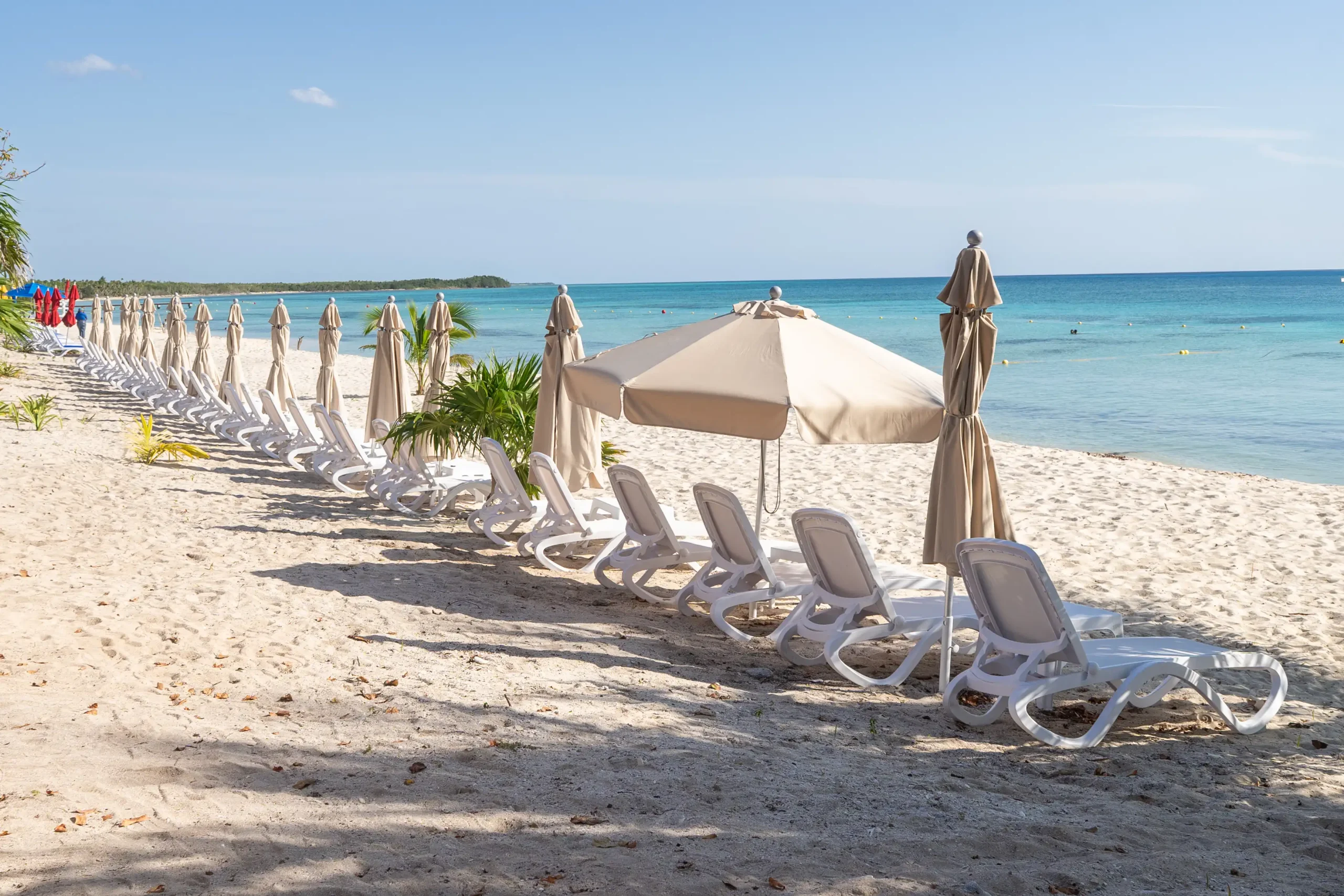 Lounge chairs, hammocks, and shaded seating are available on a first-come, first-served basis. Activities and entertainment offerings vary by day and are weather-dependent. Water clarity and seaweed conditions may change seasonally, and some beach areas may include rocky terrain—water shoes are recommended.